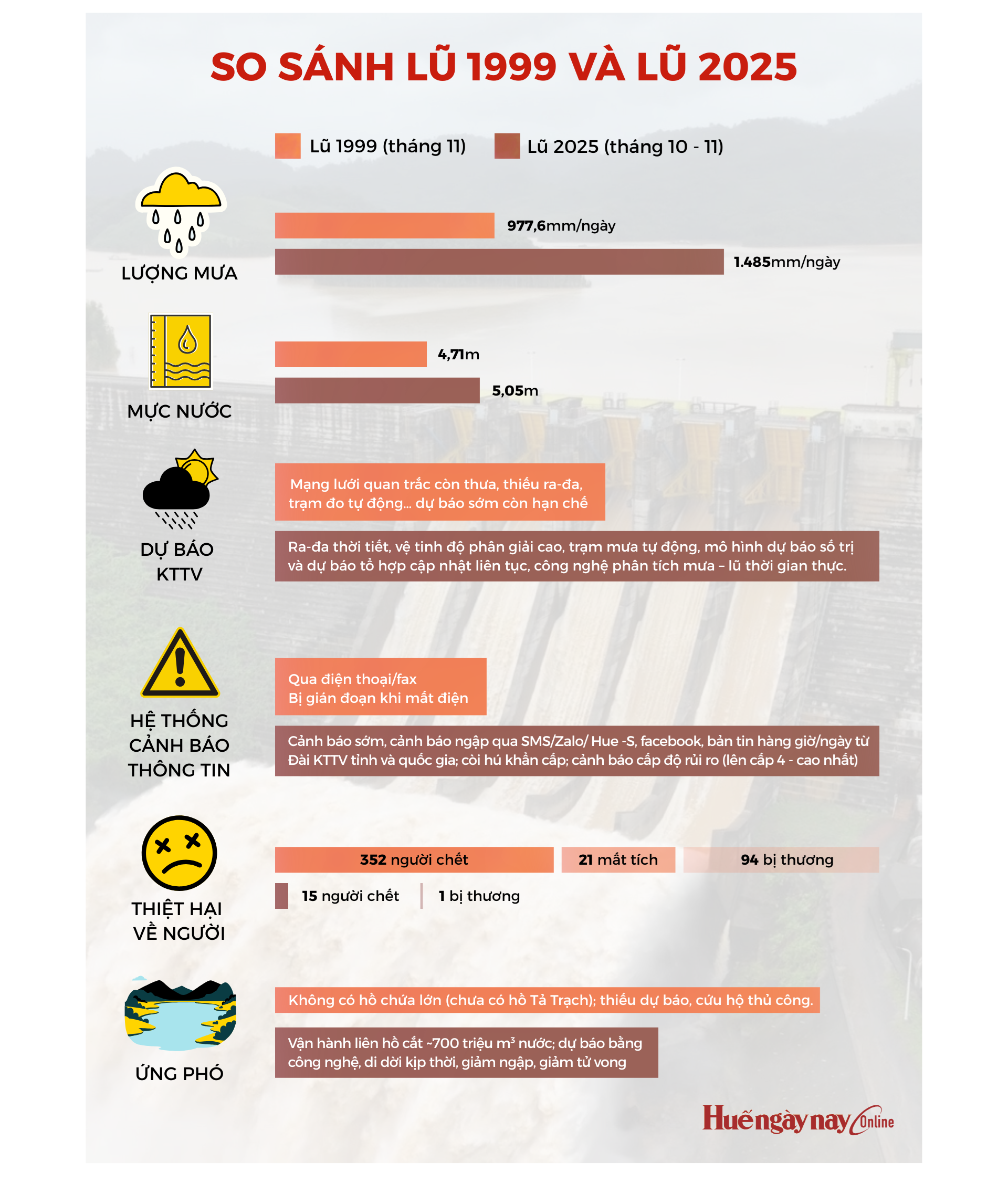 “Nói cách khác, năm 1999 là lũ đơn, năm 2025 là lũ kép. Biến đổi khí hậu đã tạo nên những đột biến thiên tai, không còn theo quy luật’’, ông Hùng khái quát.