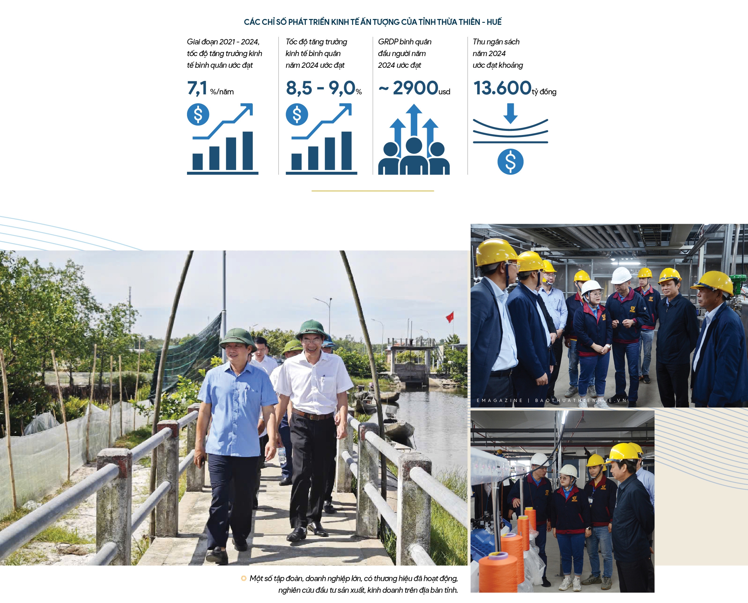 Một số tập đoàn, doanh nghiệp lớn, có thương hiệu đã hoạt động, nghiên cứu đầu tư sản xuất, kinh doanh trên địa bàn tỉnh, như: VinGroup, Banyan Tree, BRG, AEON Nhật Bản… Đáng chú ý, một số dự án tạo năng lực mới đã đi vào hoạt động, như: Dự án Kim Long Motors Huế (giai đoạn 1) công suất 3.500 chiếc/năm; Nhà máy Kanglongda (giai đoạn 1), Nhà máy Xử lý rác thải sinh hoạt Phú Sơn, Nhà máy Xử lý nước sạch Vạn Niên, nhà máy Scavi Huế 02, Trung tâm Thương mại AEON Mall Huế chính thức mở cửa đón khách; khai trương Sân Golf Golden Sands Golf Resort tại huyện Phú Vang… Kinh tế biển và đầm phá cũng đang trở thành động lực phát triển của tỉnh, tạo diện mạo mới cho toàn vùng, góp phần khai thác lợi thế phát triển du lịch và thủy sản.