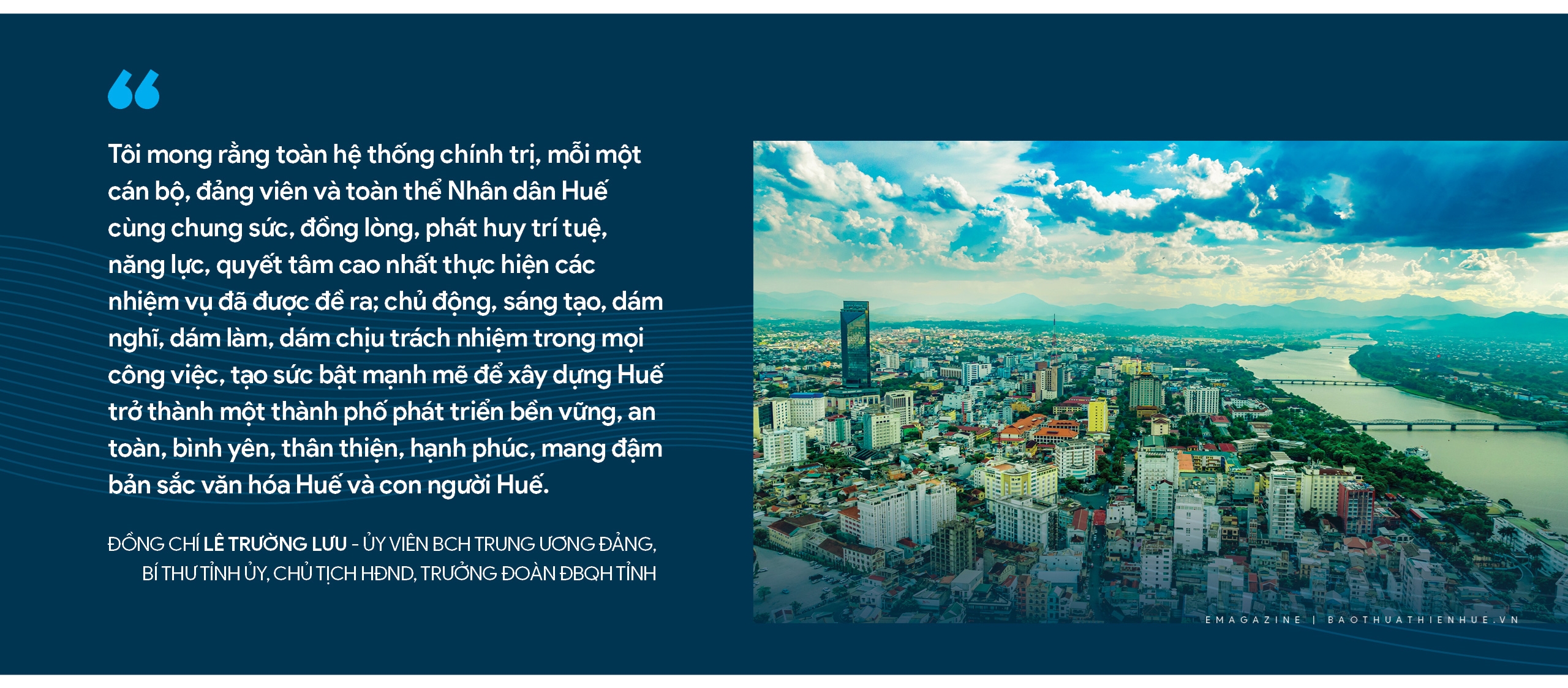 Vai trò, nhiệm vụ sắp đến của một thành phố trực thuộc Trung ương sẽ rất nặng nề, song đầy vinh quang và tự hào. Vì vậy, tôi mong rằng toàn hệ thống chính trị, mỗi một cán bộ, đảng viên và toàn thể Nhân dân Huế cùng chung sức, đồng lòng, phát huy trí tuệ, năng lực, quyết tâm cao nhất thực hiện các nhiệm vụ đã được đề ra; chủ động, sáng tạo, dám nghĩ, dám làm, dám chịu trách nhiệm trong mọi công việc, tạo sức bật mạnh mẽ để xây dựng Huế trở thành một thành phố phát triển bền vững, an toàn, bình yên, thân thiện, hạnh phúc, mang đậm bản sắc văn hóa Huế và con người Huế.