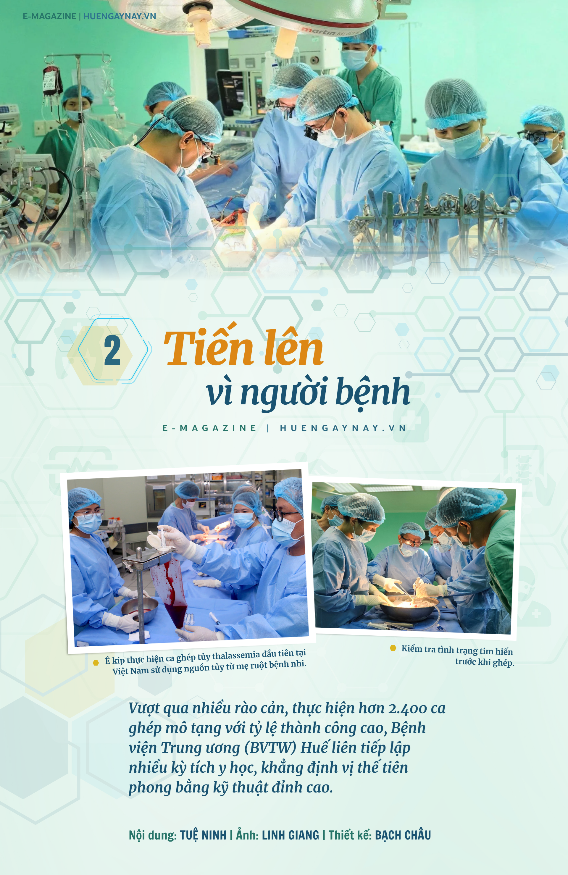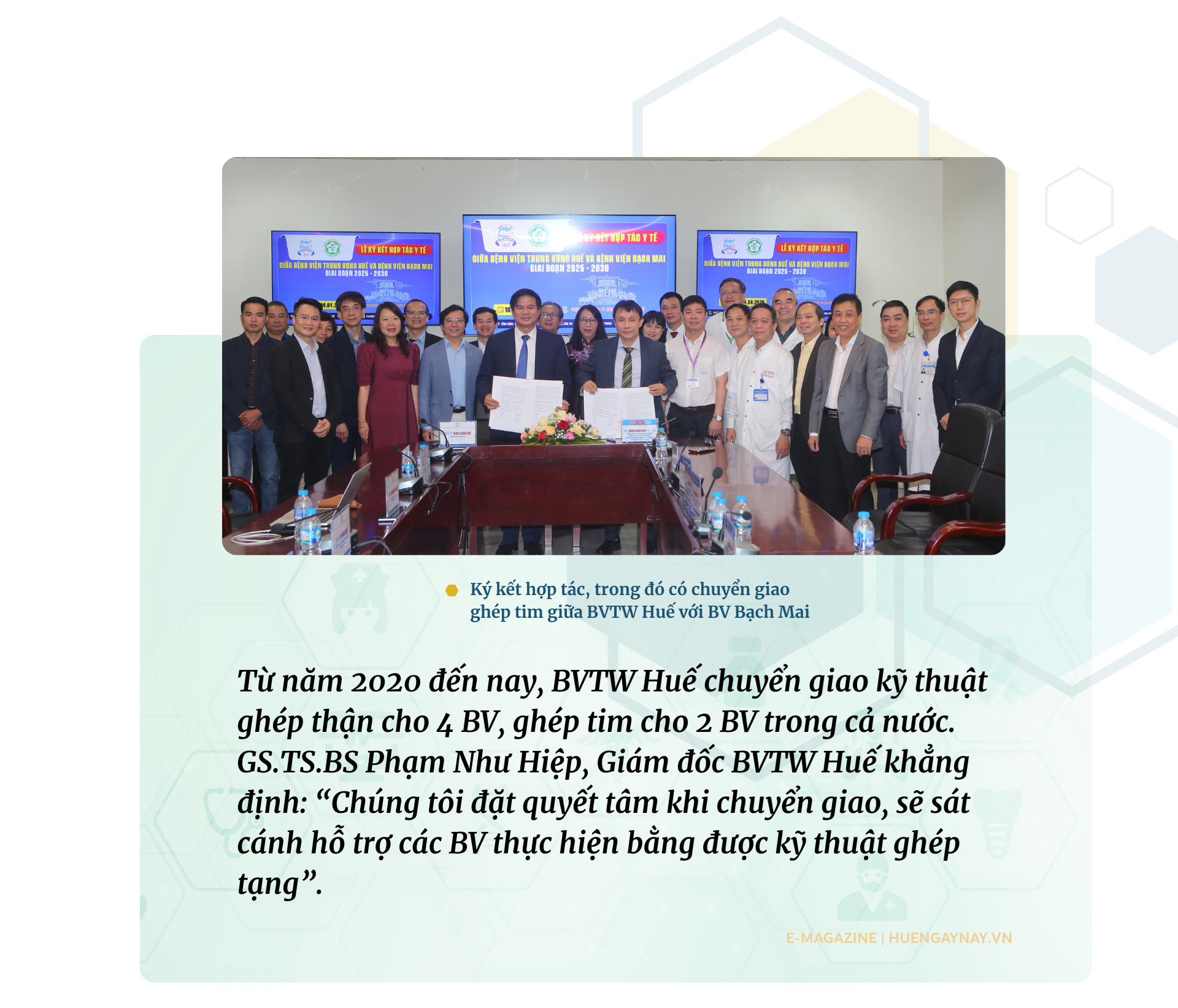 Ngày 6/5/2022, BV thực hiện ca ghép tim xuyên Việt, thiết lập kỷ lục: Rút ngắn tối đa thời gian bảo quản tim, thời gian phẫu thuật và thời gian hồi phục sau mổ. Tiếp đó, trong 48 giờ của ngày 2/4/2024, đơn vị triển khai đồng loạt 4 ca ghép thận cùng huyết thống, 1 ca ghép thận tự thân, 3 ca ghép tạng xuyên Việt; lần đầu tiên tại Việt Nam, ghép bộ ba tim - gan - thận từ người cho chết não ở tuyến tỉnh. Trung tuần tháng 6/2025, ê kíp ghi thêm mốc son mới khi đồng thời thực hiện thành công 4 ca ghép tim, gan, giác mạc xuyên Việt, gửi đi thông điệp nhân văn về sự sống không ngừng được hồi sinh trên đất Cố đô.