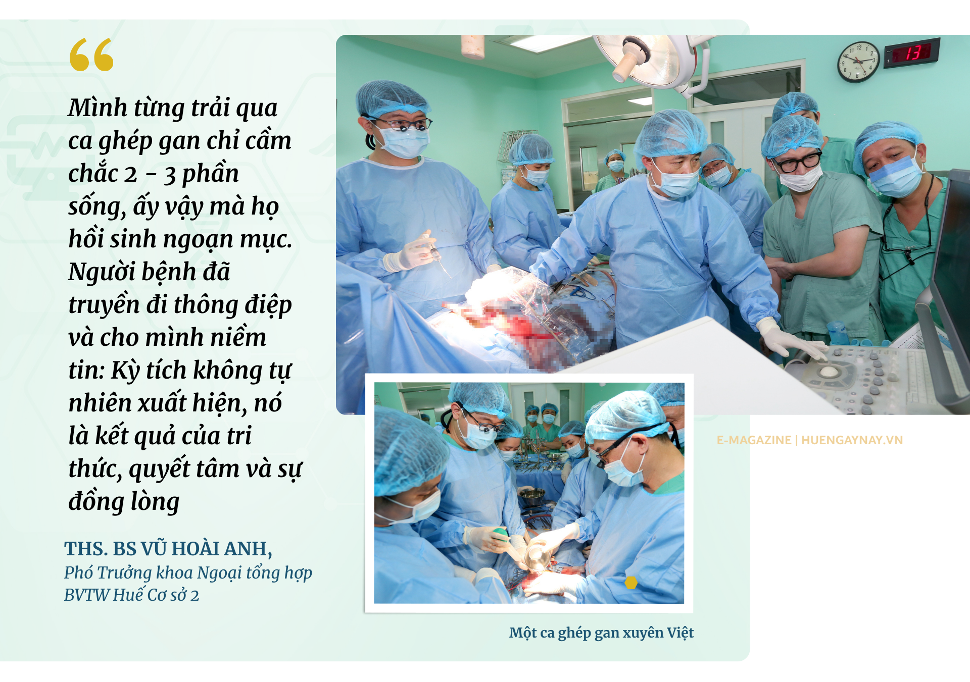Nhìn về tương lai, các bác sĩ trẻ trở về từ các trung tâm y học hàng đầu thế giới được kỳ vọng sẽ tạo nên những bước tiến mới trong ghép gan. Hy vọng đó được gửi gắm vào những người như ThS. BS Vũ Hoài Anh, Phó Trưởng khoa Ngoại tổng hợp BVTW Huế Cơ sở 2. Vị bác sĩ nhiệt huyết này sắp có chuyến trở lại Pháp, học tập ở lĩnh vực chuyên sâu anh đang theo đuổi. Anh tâm sự: “Mình từng trải qua ca ghép gan chỉ cầm chắc 2 - 3 phần sống, ấy vậy mà họ hồi sinh ngoạn mục. Người bệnh đã truyền đi thông điệp và cho mình niềm tin: Kỳ tích không tự nhiên xuất hiện, nó là kết quả của tri thức, quyết tâm và sự đồng lòng”.