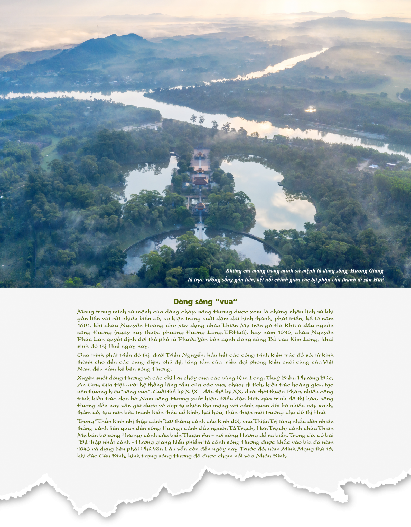 Được xem là con sông thơ mộng, đẹp nhất Việt Nam, Hương Giang là trục xương sống gắn liền, kết nối chính giữa các bộ phận cấu thành di sản Huế. Dòng sông ấy chính là khởi nguồn của thi ca, nhạc hoạ, kiến trúc đặc trưng của xứ Huế.