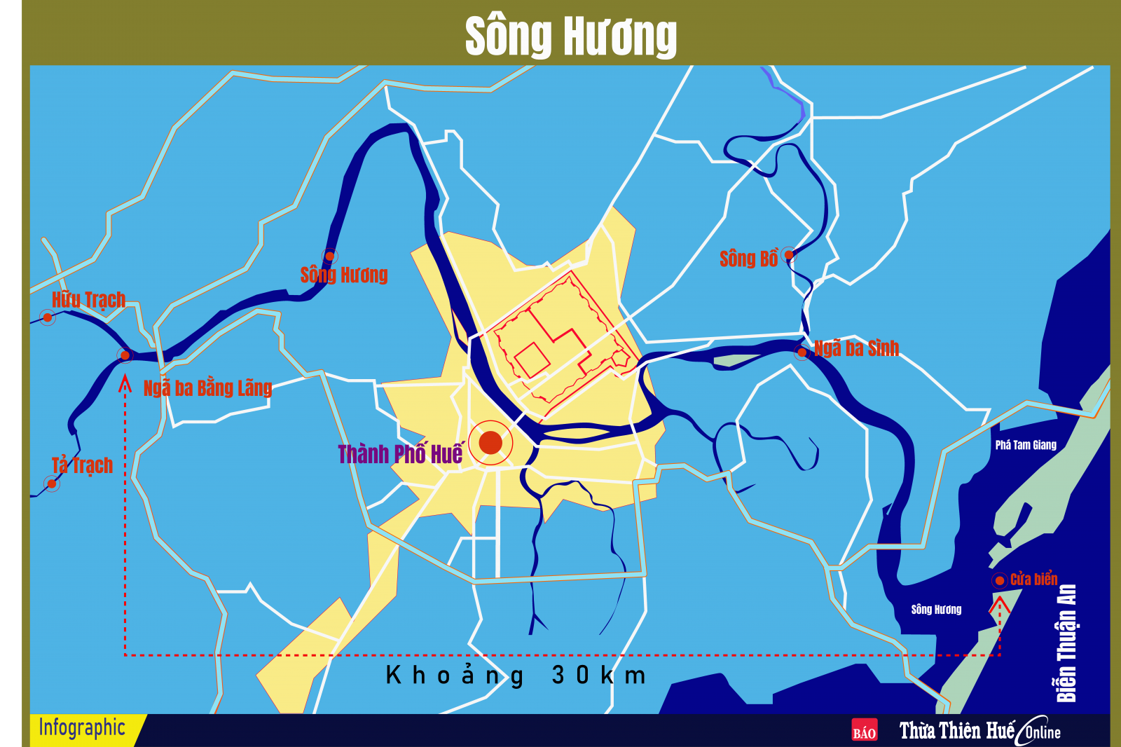 Hợp lưu từ hai nhánh Tả Trạch và Hữu Trạch ngay ngã ba Bằng Lãng, sông Hương cứ thế uốn lượn mềm mại qua các đền đài lăng tẩm, những làng mạc bình yên, trù phú. Sông Hương cũng chính là minh đường trong yếu tố phong thủy chủ đạo của kinh thành Huế trước khi xuôi ra biển lớn.