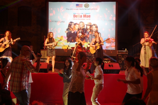 Cả sân khấu rộn ràng tiếng vỗ tay khi những ca khúc đầu tiên được cả 5 thành viên trong ban nhạc Della Mae cất lên. Ban nhạc gồm có Celia Woodsmith (ca sĩ), Jenni Lyn Gardner (mandolin), Courtney Hartman (guitar, banjo), Zoe Guigueno (bass) và người sáng lập ban nhạc là Kimber Ludiker (fiddle). Điểm đặc biệt, mỗi thành viên của ban nhạc chơi một nhạc cụ, nhưng tất cả đều hát được, và gần như giống nhau ở từng lời hát, giai điệu. Mặc dù chỉ diễn ra đúng một giờ đồng hồ, cả 5 cô gái đã thể hiện hơn 10 ca khúc do chính ban nhạc sáng tác, hòa âm phối khí bằng lời ca nhẹ nhàng, du dương nói về tình yêu, cuộc sống và những điều tốt đẹp hiện diện trên cuộc đời này. Cả sân khấu như bất ngờ, ấn tượng khi mà cả ban nhạc cùng phối bài dân ca của Việt Nam là ca khúc Hoa thơm bướm lượn rất thuần thục, và mới lạ. “Thật là tuyệt vời, một đêm nhạc thú vị, gần gũi, dễ thương”, chị Nguyễn Minh Trang (TP Huế) nhận xét. Rất nhiều người đã đứng dậy vỗ cao tay và nhảy theo từng điệu nhạc, sân khấu khu vực cung An Định trở nên rộn ràng, sôi động…