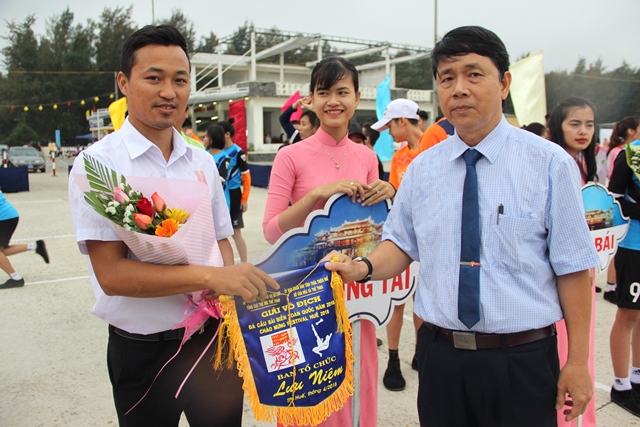 Ông Lê Xuân Bình (phải), Phó Giám đốc Sở Văn hóa và Thể thao trao cờ lưu niệm cho các đơn vị tham gia giải