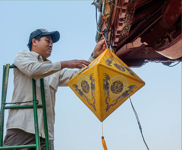Anh Hoàng Đại Tý - nhân viên Tổ quản lý điện - Văn phòng trung tâm Bảo tồn Di tích Cố đô Huế treo đèn lồng tại mái lầu Ngũ phụng chuẩn bị cho festival. Ảnh: Bảo Minh