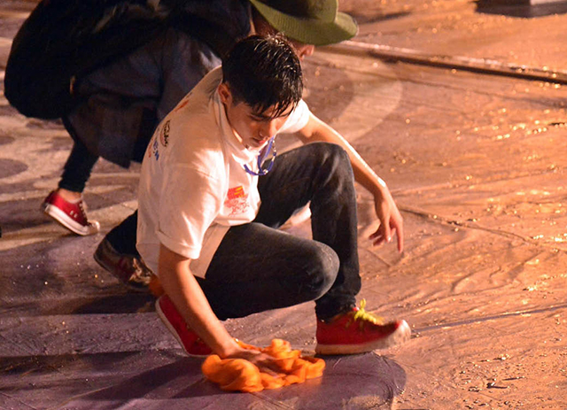 Tình nguyện viên lau sân khấu khai mạc Festival Huế 2016 sau trận mưa lớn