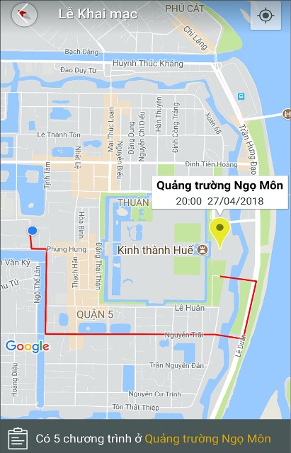 Một tính năng khác trong ứng dụng mà BTC Festival Huế 2018 khá tâm đắc là có thể giúp người dùng xem các chương trình đang diễn ra quanh vị trí người dùng đang đứng. Cụ thể, người dùng chỉ cần chọn vị trí đang đứng, ứng dụng sẽ tự động tìm kiếm các chương trình đang diễn ra tại thời điểm đó. Chẳng hạn người dùng đang đứng ở Đại Nội vào lúc 20h ngày 30/4, trong khi đó có thêm 5 chương trình đang diễn ra trong phạm vi bán kính 3km (bán kính có thể tuỳ chọn) thì trên bản đồ sẽ xuất hiện các điểm diễn mà chương trình đó đang diễn ra. Người dùng chỉ cần chọn vào điểm diễn để biết thông tin chương trình và nếu muốn đến thì vào mục bản đồ, ứng dụng sẽ chỉ đường.
