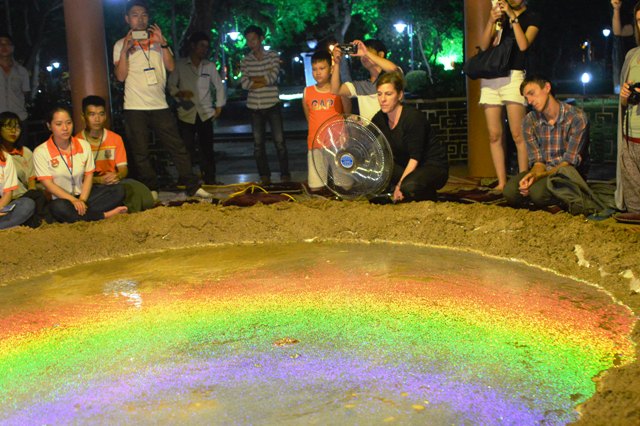 Nghệ sỹ Gwendolie Robin đang rắc nguyên liệu tượng trưng cho dải thiên hà.