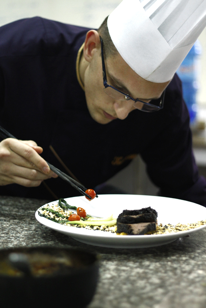 Bếp trưởng Hue Purple - Kevin Marchetti tỉ mỉ trang trí món ăn.