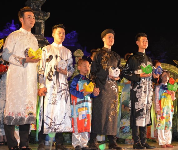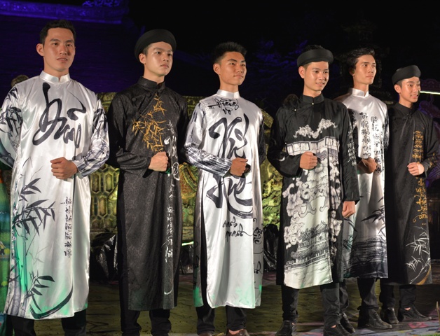 Ấn tượng hơn là 3 bộ sưu tập áo dài, gồm áo dài nam giới “Thư họa”, nữ giới “Về miền Hương Ngự” và thiếu nhi “Quê hương trong mắt trẻ thơ”. Bộ sưu tập áo dài nam giới lấy cảm hứng từ nghệ thuật thư pháp. Áo dài nữ có ý tưởng từ những tác phẩm tranh gương độc đáo của mỹ thuật cung đình triều Nguyễn, cùng kỹ thuật chạm lộng từ nghệ thuật chạm khắc độc đáo. Trang phục của các em thiếu nhi là những tà áo được lấy ý tưởng từ những bức tranh thiếu nhi của cuộc thi vẽ tranh về chủ đề Quê hương.