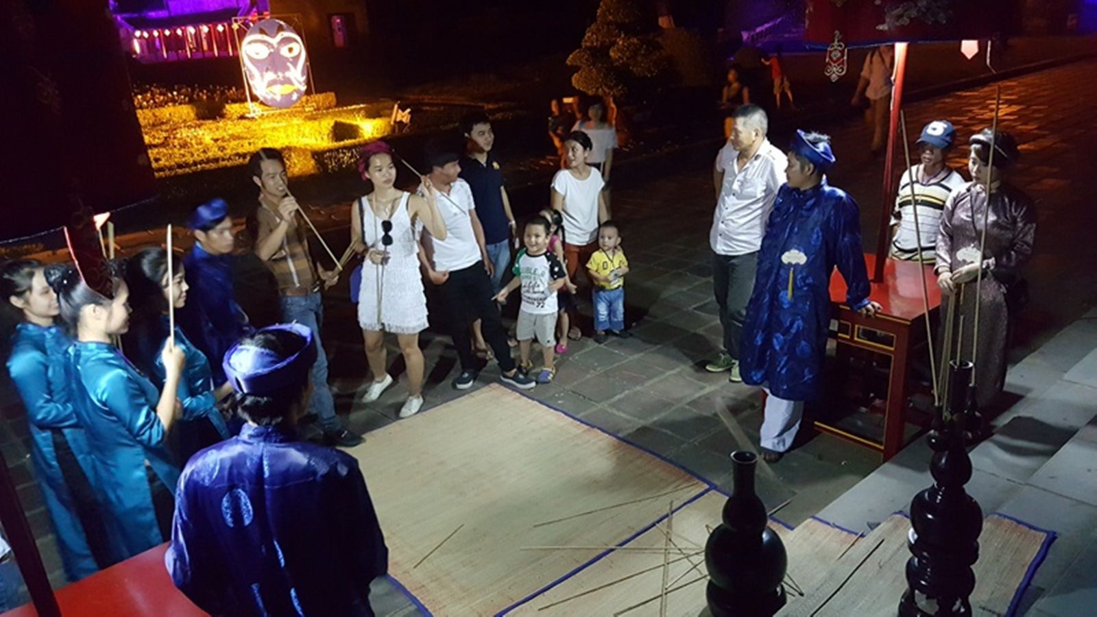 Chương trình “Ca múa nhạc truyền thống” được tổ chức ở sân điện Thái Hòa, kết hợp mỹ thuật sắp đặt mặt nạ tuồng, sắp đặt “bãi triều” và triển lãm trưng bày cổ vật ngự thiện, ngự bút châu phê của Hoàng đế, họa tiết cung đình, Huế xưa… tạo nên chuỗi liên hoàn trong Đại Nội giúp du khách có những trải nghiệm, khám phá không thể nào quên.