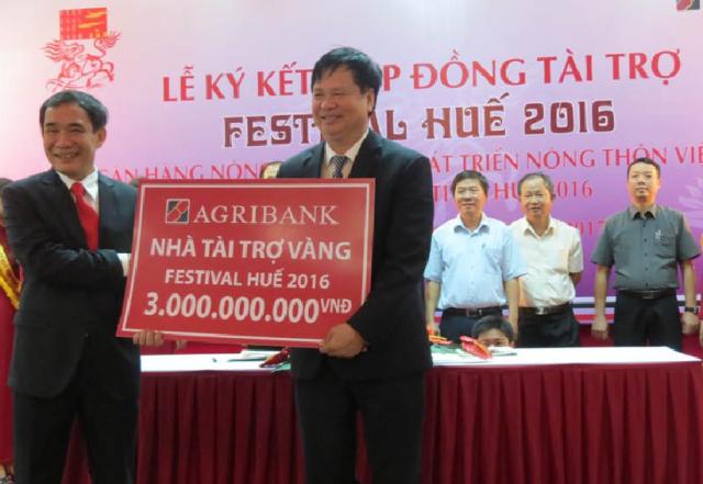 HNN - Hợp đồng tài trợ cho Festival Huế 2016 trị giá 3 tỷ đồng đã được Ban Tổ chức Festival Huế 2016 và đại diện Ngân hàng Nông nghiệp & Phát triển Nông thôn Việt Nam (Agribank Việt Nam) cùng ký kết sáng 2/12. Đây cũng là số tiền lớn nhất từ trước tới nay Agribank Việt Nam tài trợ cho Festival Huế.