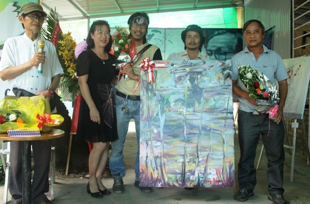 Họa sỹ Nguyễn Viết Dũng (thứ ba từ trái sang) bên tác phẩm của mình được bán cho khách hàng