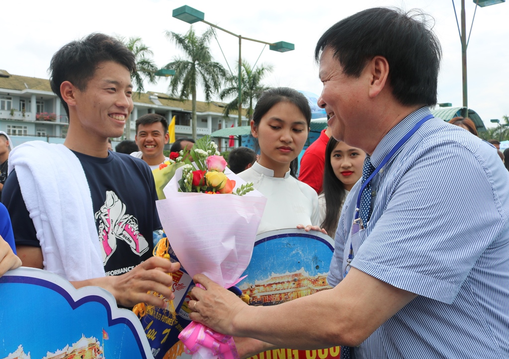 Ông Nguyễn Dung, Phó Chủ tịch UBND tỉnh, Trưởng Ban tổ chức Festival Huế 2018 tặng cờ lưu niệm và hoa chúc mừng các đoàn VĐV tham dự giải