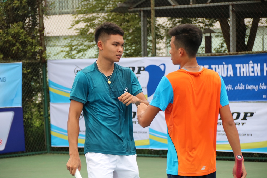 Hai tay vợt của Việt Nam là Trịnh Linh Giang và Nguyễn Văn Phương động viên nhau cố gắng sau một pha bóng lỗi