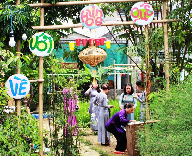 Hiện ra trước mắt chúng tôi là “ruộng lúa”, “ao cá”, giàn bầu, xe đạp nước… những khung cảnh gợi nhớ về miền quê trong ký ức của bao người. Trong khuôn viên nhỏ nhắn của ngôi nhà số 4/8 đường Tú Xương (Tp. Huế), các tiểu cảnh ấy đã được chăm chút từ những ngày tháng trước “chờ đến” khai hội dịp Festival Huế.