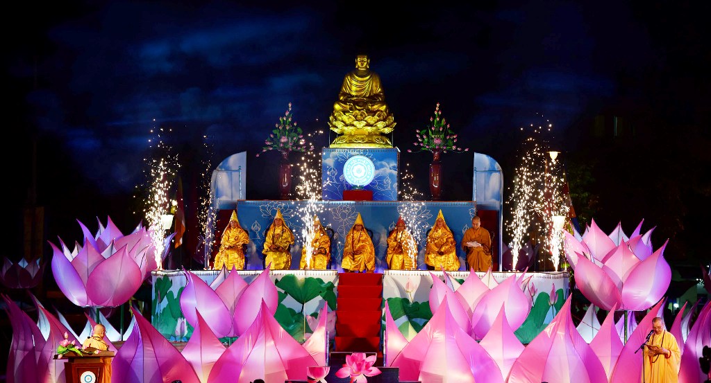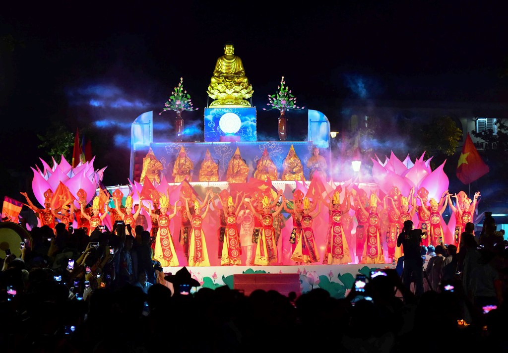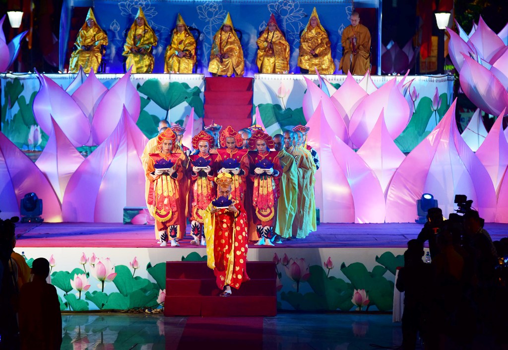 Điểm nhấn của chương trình là phần biểu diễn nghệ thuật thắp ánh sáng của lễ hội truyền đăng, cử hành nghi lễ cầu nguyện và thả đèn hoa trên sông Hương. Hằng trăm tăng ni, phật tử, quan khách xếp hàng và truyền tay nhau khoảng 5.000 ngọn đèn từ phía lễ đài chính xuống bờ sông Hương. Cùng với đó là 25 thuyền hoa, mỗi thuyền 1.000 hoa đăng được thả suống dòng sông trong thanh tịnh, trang nghiêm, thể hiện sự lung linh, huyền ảo của ánh sáng hoa đăng về đêm. Mỗi ngọn hoa đăng được thả xuống ai cũng muốn gửi vào đó một thông điệp thiện lành để cầu nguyện cho đất nước thanh bình, mưa thuận gió hòa, nhân dân an cư lạc nghiệp và xã hội được hòa bình, tươi đẹp, phồn thịnh.