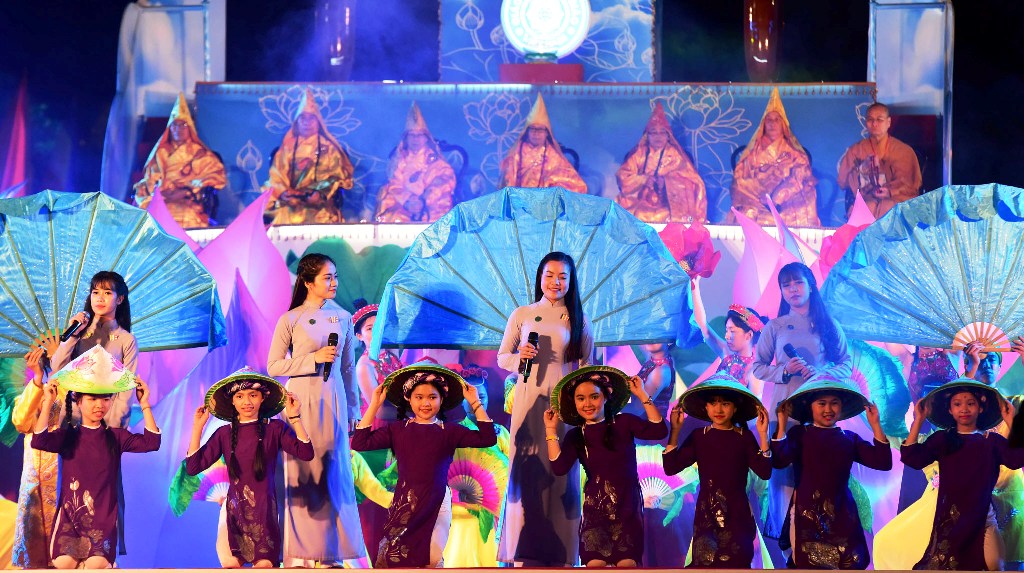 Trong không gian thơ mộng bên dòng Hương Giang hiền hòa, những bài tán trong kinh Phật được các tăng ni, phật tử cùng niệm thành kính. Bên cạnh những nghi lễ tôn nghiêm của Phật giáo, du khách còn được thưởng thức những tiết mục ca, múa đẹp mắt… Đây là những làn điệu, ca khúc, âm nhạc, kinh tấn kệ tụng với những giai điệu, tiết tấu phù hợp với không gian lễ hội, có nội dung ca ngợi, tôn vinh giá trị truyền thống văn hóa, lịch sử của dân tộc, đạo pháp và quê hương. Những giai điệu vui nhộn, sâu lắng, mượt mà đi vào lòng người, biểu thị tình cảm hân hoan và sự thành tâm trong ý nghĩa cầu nguyện đất nước thanh bình, mưa thuận gió hòa, vạn sự an lành, tốt đẹp, hạnh phúc.