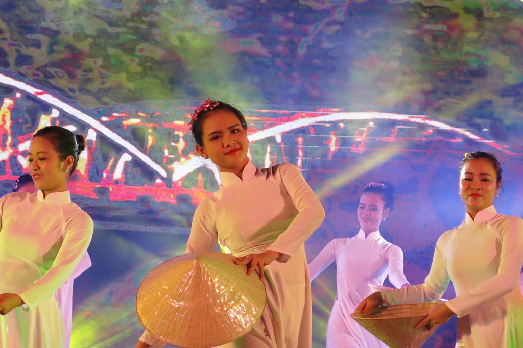 Với phần minh họa của ngôn ngữ múa, khán giả được thấy những hình ảnh đặc trưng gắn liền với xứ Huế mộng mơ: Tà áo dài thướt tha, mái tóc dài e ấp của cô gái Huế, chiếc nón bài thơ của nữ sinh sau giờ tan học...
