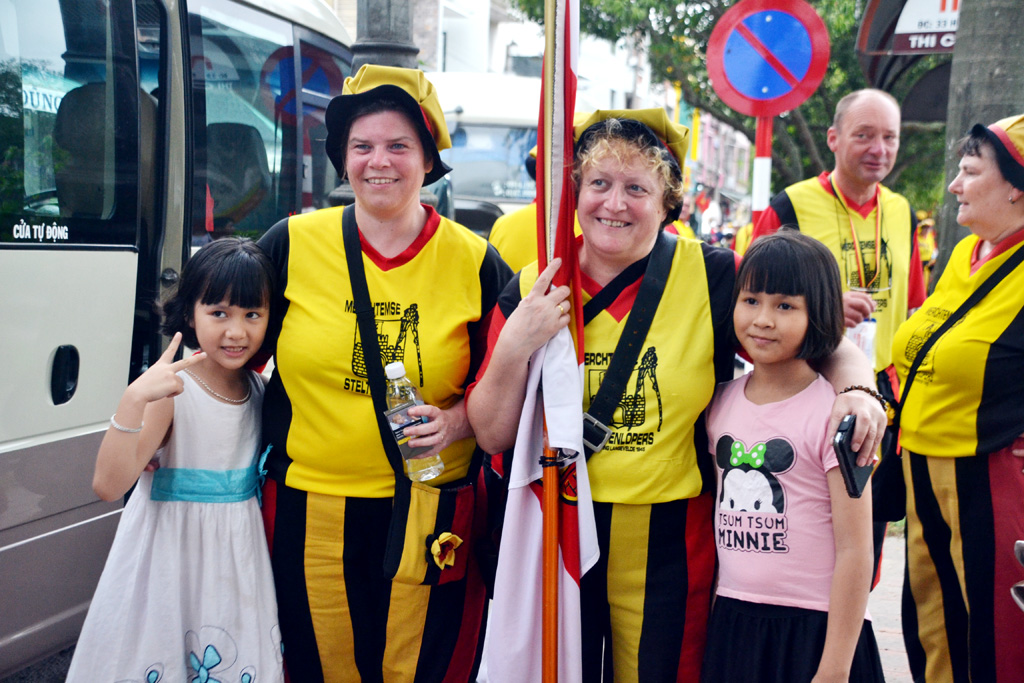 Các em nhỏ tranh thủ chụp hình với đoàn cà kheo đến từ nước Bỉ