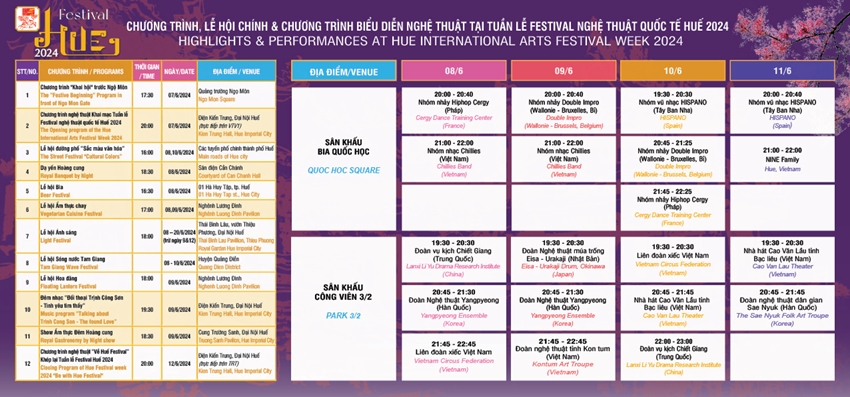 -Tạo điều kiện cho du khách nắm bắt các thông tin và chương trình trong những ngày diễn ra Festival, Ban Tổ chức Festival Huế 2024 vừa công bố Lịch chương trình lễ hội chính, hoạt động hưởng ứng, chương trình biểu diễn nghệ thuật cộng đồng và bản đồ các sân khấu, điểm biểu diễn tại Tuần lễ Festival nghệ thuật Quốc tế Huế 2024.