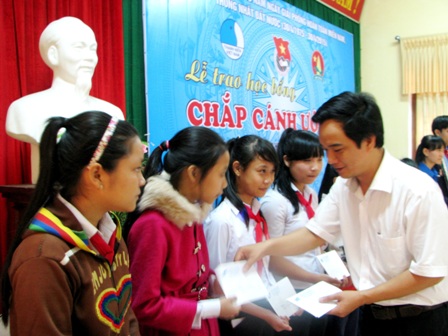 Bí thư Tỉnh đoàn Nguyễn Chí Quang trao học bổng cho các em học sinh