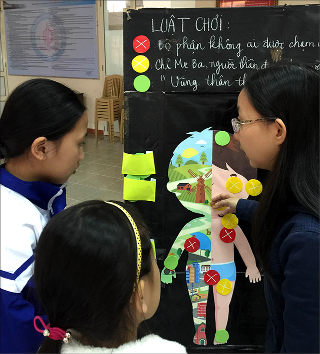 Khi đến với triển lãm, các phụ huynh và con mình còn được tham gia vào một chuỗi các trò chơi tương tác thú vị, mang tính giáo dục và giúp nâng cao nhận thức về xâm hại tình dục. Đó là trò chơi “vương quốc con cũng có vùng cấm” - gọi tên các vùng riêng tư và vùng thân thiện trên cơ thể, trò chơi “buồng kín” - nơi mẹ cùng con có thể trò chuyện cởi mở về giới tính và xâm hại tình dục qua những câu hỏi gần gũi: Con sinh ra bằng cách nào? Những ai ôm con mà con cảm thấy không an toàn? Nơi nào là nơi không được ai đụng chạm vào? Con có nghĩ mình đang sống trong một môi trường an toàn không? Đâu là vùng kín của con?...