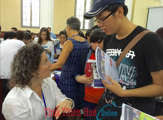 Đại diện các trường đại học Hoa Kỳ cung cấp thông tin về chương trình đào tạo của trường mình cho sinh viên Huế tại Triển lãm du học Hoa Kỳ mùa thu
