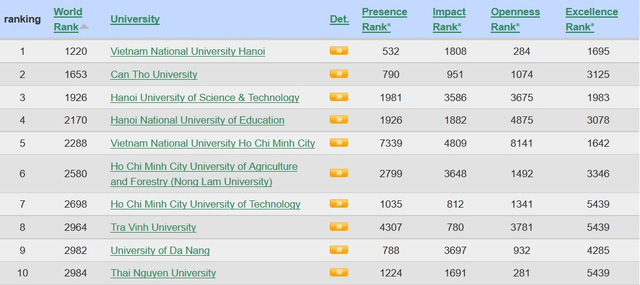 Top 10 cơ sở giáo dục đại học Việt Nam trong bảng xếp hạng là: ĐHQGHN (đứng thứ 1 Việt Nam, thứ 26 Đông Nam Á), Trường Đại học Cần Thơ (2 – 39), Trường Đại học Bách khoa Hà Nội (3 – 47), Trường Đại học Sư phạm Hà Nội (4 - 60), ĐHQG Tp.HCM (5 – 66), Trường ĐH Nông Lâm Tp.HCM (6 – 80), Trường Đại học Bách khoa Tp.HCM (7 – 86), Trường Đại học Trà Vinh (8 – 100), Đại học Đà Nẵng (9 - 101) và cuối cùng là Đại học Thái Nguyên (10 – 102).