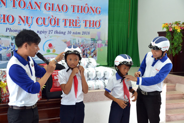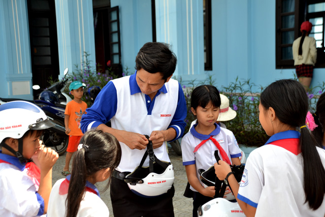 Tại chương trình, các em được nhân viên Honda Lộc Thịnh hướng dẫn cách đội mũ bảo hiểm an toàn, cách ngồi đúng tư thế ở phía sau xe máy; cách kiểm tra xe đạp an toàn trước khi đi học…