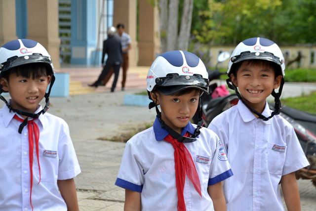 Căn dặn các em nhớ đội mũ bảo hiểm khi được bố mẹ chở bằng xe máy