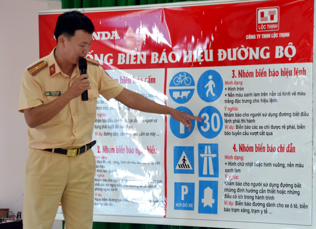 Đại diện Phòng Cảnh sát Giao thông, Công an huyện Phong Điền giới thiệu đến các em một số biển báo giao thông cơ bản; giao lưu và hướng dẫn cho các em cách lưu thông an toàn, lúc qua đường cần quan sát kỹ, không được đi hàng 2, hàng 3 khi đi học…