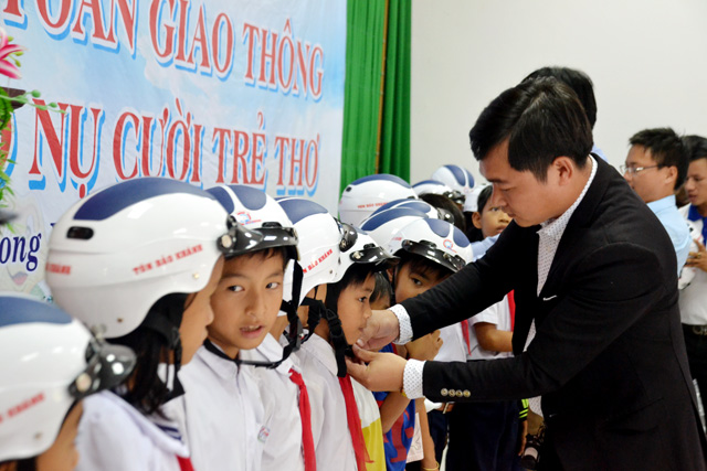 Đại diện Công ty TNHH Tôn Bảo Khánh trao 161 mũ bảo hiểm đạt chuẩn cho các em