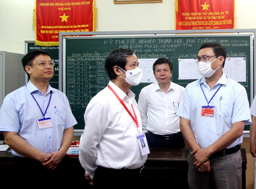 “Qua kiểm tra cho thấy, Ban chỉ đạo kỳ thi tốt nghiệp Trung học phổ thông năm 2022 của tỉnh Thừa Thiên Huế nói chung và lực lượng cán bộ, giáo viên, nhân lực tác nghiệp tại điểm thi Trường trung học phổ thông Đặng Huy Trứ nói riêng đã chuẩn bị cho kỳ thi rất chu đáo. Trong việc tổ chức kỳ thi năm nay, các điểm thi cần lưu ý về việc bố trí nơi để vật dụng, tư trang cho thí sinh phải cách xa khu vực phòng thi ít nhất 25m” – Bộ trưởng Nguyễn Kim Sơn chia sẻ.