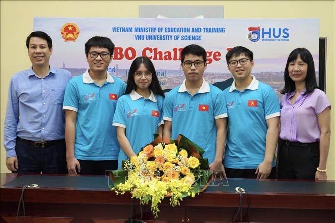 Bốn thí sinh Việt Nam đoạt thành tích xuất sắc tại Olympic Sinh học quốc tế 2021. Ảnh: TTXVN phát
