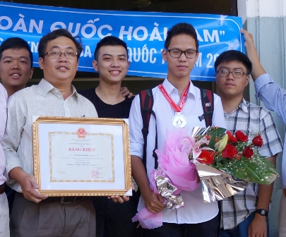 Hoài Nam với tấm HCB trong vòng tay bạn bè, thầy cô và gia đình