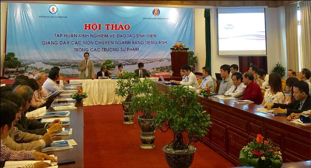 Trong báo cáo đề dẫn tại hội thảo, PGS.TS.Nguyễn Sỹ Thư, Trưởng Ban quản lý Đề án ngoại ngữ Quốc gia 2020 cho rằng, Đề án ngoại ngữ Quốc gia 2020 đã bước sang năm thứ 5 với nhiều hoạt động đa dạng, nhiều mô hình phát triển dạy và học ngoại ngữ được thực hiện. Bên cạnh những thành tựu đạt được, vẫn còn nhiều vấn đề cấp bách cần phải giải quyết và một trong những vấn đề đó là lĩnh vực giảng dạy các môn chuyên ngành bằng ngoại ngữ ở các trường cao đẳng, đại học; trong đó vấn đề đào tạo giảng viên để có thể giảng dạy các môn chuyên ngành bằng ngoại ngữ là một nhiệm vụ rất quan trọng. Nhiệm vụ này là trách nhiệm của các trường đại học, cao đẳng nói chung và các trường sư phạm nói riêng...