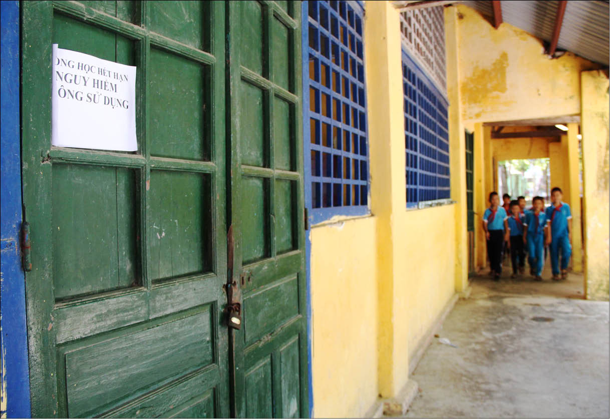 Dãy học tầng trệt chính diện Trường tiểu học Trường An xuống cấp nghiêm trọng, nhà trường phải khóa trái cửa, dán thông báo nguy hiểm