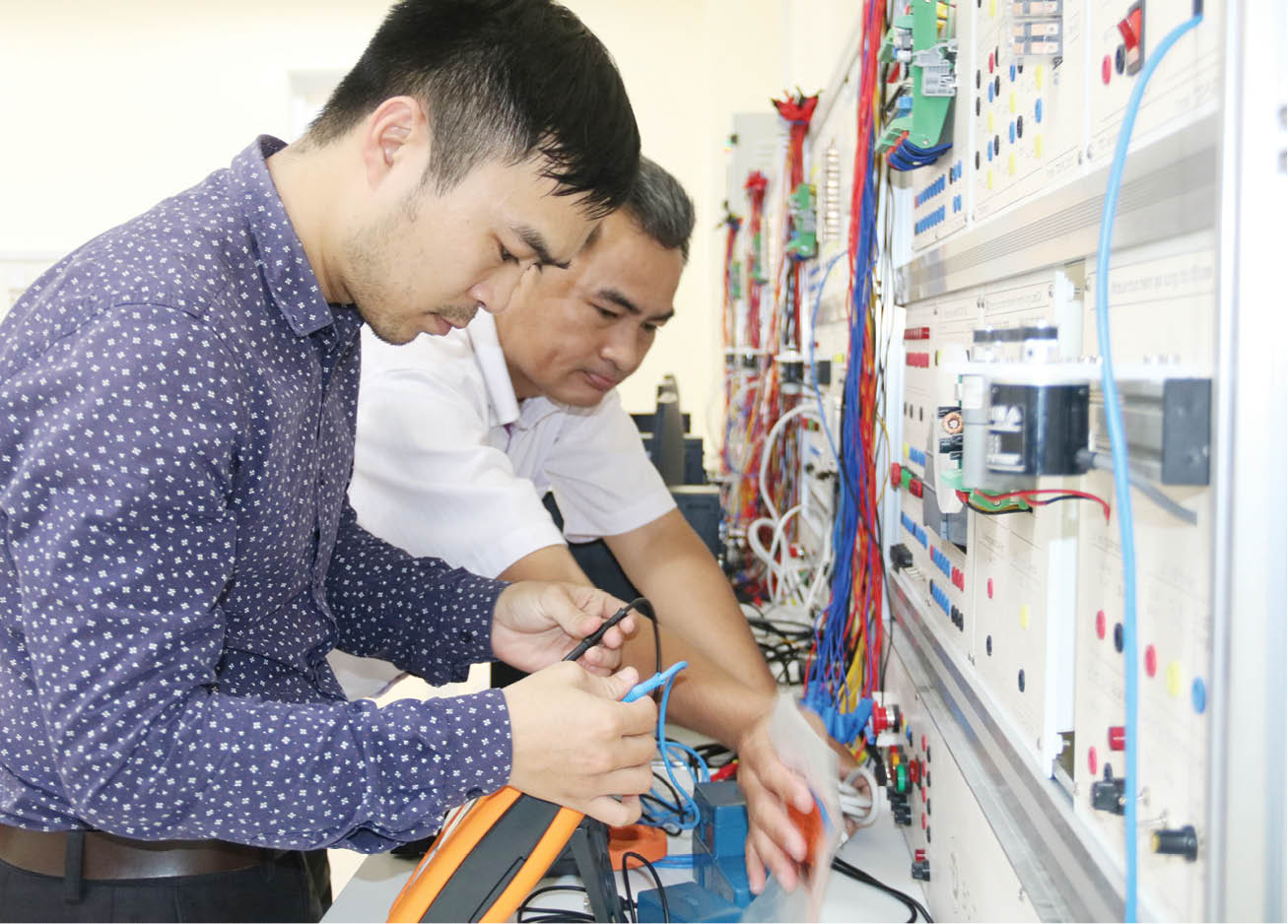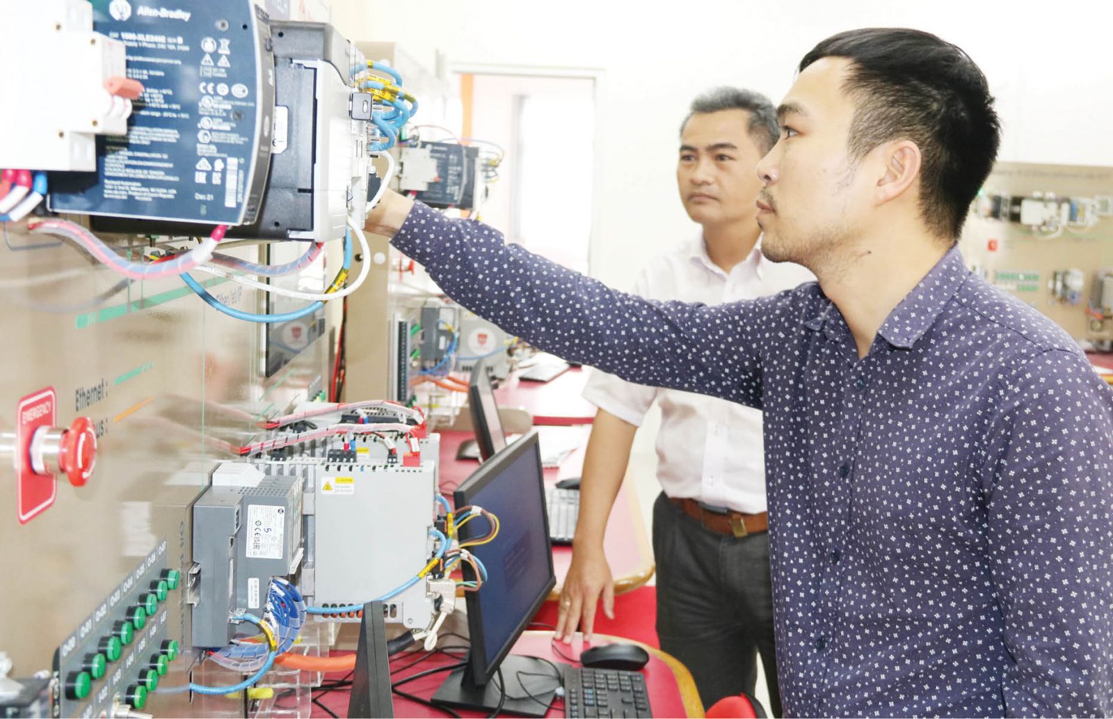 Anh Ngô Xuân Cường (phải) kiểm tra hệ thống phục vụ giảng dạy thực hành cho sinh viên