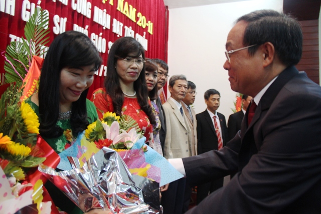 Ông Nguyễn Văn Cao – Phó Bí thư Tỉnh ủy, Chủ tịch UBND tỉnh tặng hoa chúc mừng các tân GS, PGS
