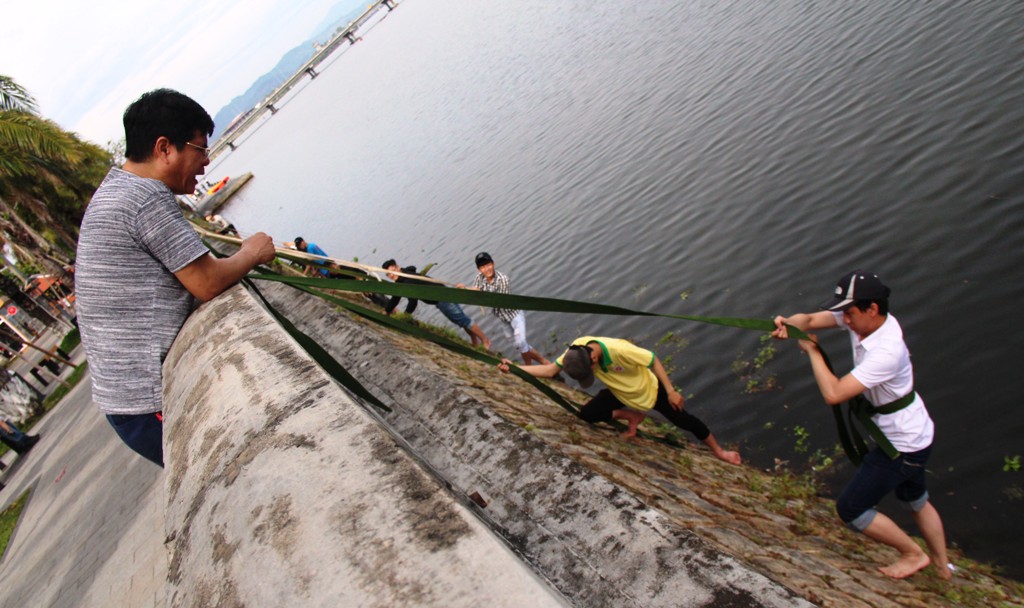 Các võ sinh Võ đường Nghĩa Dũng đu dây từ trên lan can đường đi bộ xuống bờ sông Hương để tiến hành nhặt rác