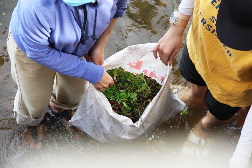 Cỏ rác được các võ sinh nhặt ờ bờ sông Hương được đưa vào bao trước khi tập kết đến bãi rác công cộng