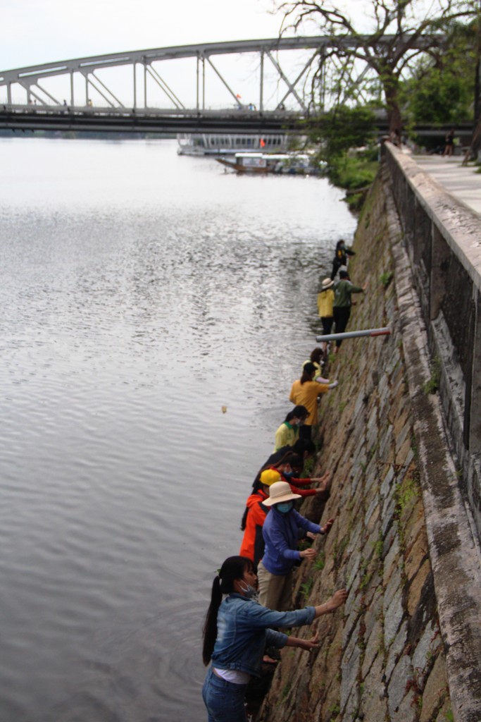Khu vực này có lan can bê tông khá cao, địa hình kè đá bên dưới khá phức tạp. Vì thế các võ sinh đã phải chuẩn bị dây thừng, thang dài tiện cho việc di chuyển xuống phía dưới vừa nhặt rác, vừa đảm bảo an toàn. Trước khi bắt tay vào công việc này, võ sư hướng dẫn nói qua ý nghĩa của việc nhặt rác bảo vệ môi trường và dòng sông Hương, cũng như căn dặn các võ sinh hỗ trợ lẫn nhau trong quá trình làm vệ sinh.