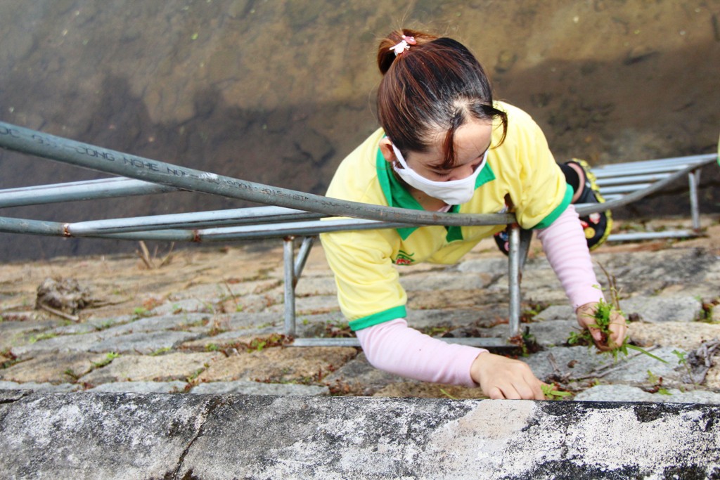 Một nhóm nữ võ sinh chăm chỉ làm sạch khu vực kè đá đoạn cạnh cầu Trường Tiền