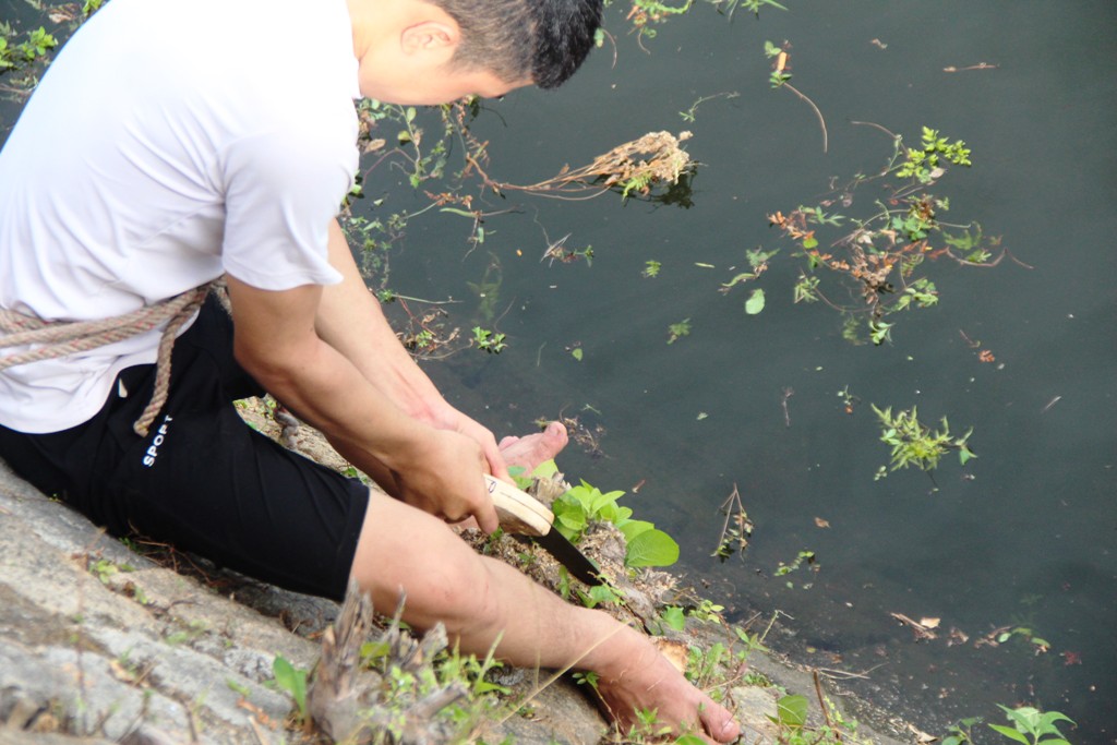 Ở một đoạn khác, một nam võ sinh được giao nhiệm vụ cưa gốc cây bám vào kè đá. Những gốc cây này thường làm kè đá hư hỏng, loang lổ