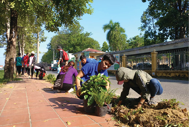Sinh viên Trường ĐH Nông Lâm dọn dẹp vệ sinh và trồng hoa ở tuyến đường trước trường