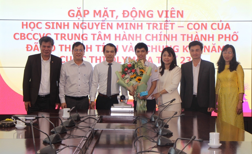 | Lãnh đạo TP. Huế tặng hoa và quà động viên em Nguyễn Minh Triết trước khi tham gia chung kết năm 2023 |