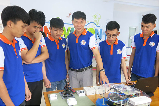 Thầy giáo Nguyễn Hữu Chúc (thứ 3, từ phải sang) hướng dẫn mô hình sáng tạo cho sinh viên