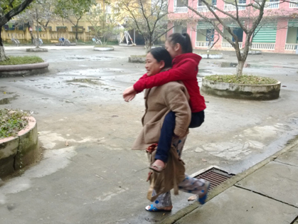 Mẹ Trang, chị Diệu Thúy rưng rưng nước mắt kể lại những buổi cho con đến trường, cảnh hai mẹ con lê la khắp bệnh viện này qua bệnh viện khác mong tìm được thầy, được thuốc cho con… “Mình nghèo quá, cái nghèo lộ rõ từ áo quần đến tiền thuốc thang khiến cho việc chữa trị của cháu không mấy may mắn”, chị kể. Trang sinh ra khi vợ chồng chị đều khỏe mạnh, cháu lọt lòng nặng 3,4kg trắng hồng, ai thấy cũng thích. Gia đình tuy khó khăn nhưng chăm sóc cháu đầy đủ, lại là con thứ hai nên chị cũng có kinh nghiệm nuôi con. Nhưng không hiểu sao Trang chậm đi, đến 2 tuổi rưỡi mới lẫm chẫm nhưng lại lóng ngóng, chạy thì được mà đứng không được. Thấy con không bình thường, vợ chồng chị đã đưa con đi khám, kể cả làng Hòa Bình nhưng đôi chân Trang yếu dần. Anh chị sau đó sinh thêm hai con.